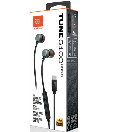 Presentamos los auriculares internos JBL Tune 310C USB-C. Son ligeros, cómodos y compactos. Un par de controladores dinámicos de 9 mm producen un potente sonido JBL Pure Bass, mientras que la compatibilidad con audio de alta resolución garantiza una excelente calidad de sonido. Una conexión USB-C los hace compatibles con una amplia gama de dispositivos, como PC, teléfonos móviles y dispositivos de juegos. Además, el control remoto de tres botones en un cable plano que no se enreda le permite controlar la reproducción de música y el ajuste de volumen, los ajustes preestablecidos del ecualizador y responder llamadas rápidamente con un micrófono incorporado. Todo esto hace que el JBL Tune 310C USB-C sea tu compañero diario en el trabajo, en casa y de viaje.