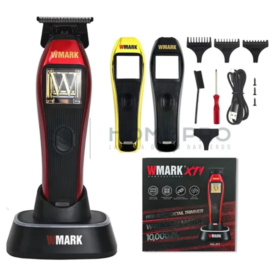 O WMARK NG-XT1 é um aparador profissional com motor vetorial Maglev (até 10000 RPM) e lâminas DLC T-style de 0.1mm para máxima precisão. Bateria de 2000mAh (150 min de uso / 3-4h de carga). Inclui 3 pentes guia (1.5/3/6mm), carregamento USB-C, base de carregamento e 2 capas extras. Ideal para delineados e acabamentos rente.