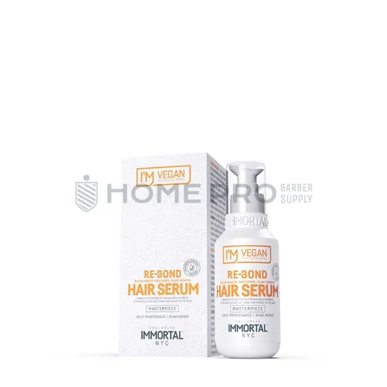 O sérum **Immortal I'm Vegan Re-Bond** é um tratamento diário para o **reparo de laços** capilares. Sua fórmula vegana com **biotina, niacinamida e queratina vegetal** fortalece e protege o cabelo, eliminando o frizz e adicionando um brilho e uma maciez incríveis. Ideal para um acabamento perfeito e um cabelo visivelmente mais saudável.