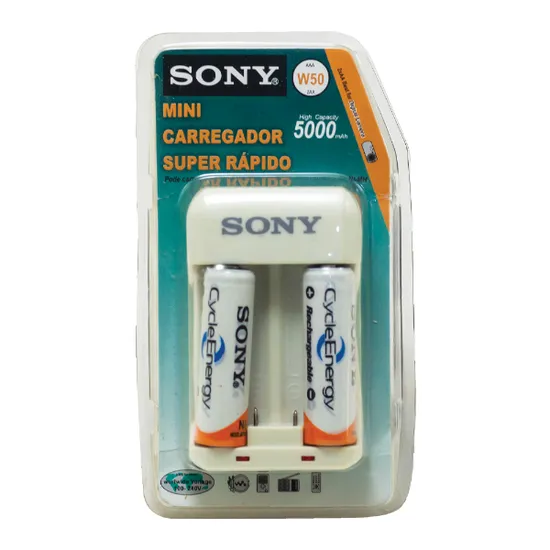 Especificações de Kit Carregador de Pilhas Sony BCG-W50 / 5000MAH para Pilha AAA e AA / com Pilha Incluida (2 Pilhas AA) / Bivolt - Branco