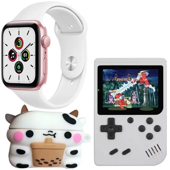 Kit Relógio K9-Combo Mini Milk Tea Cow 41 MM com Bluetooth + Fone de Ouvido Sem Fio + Console Portátil