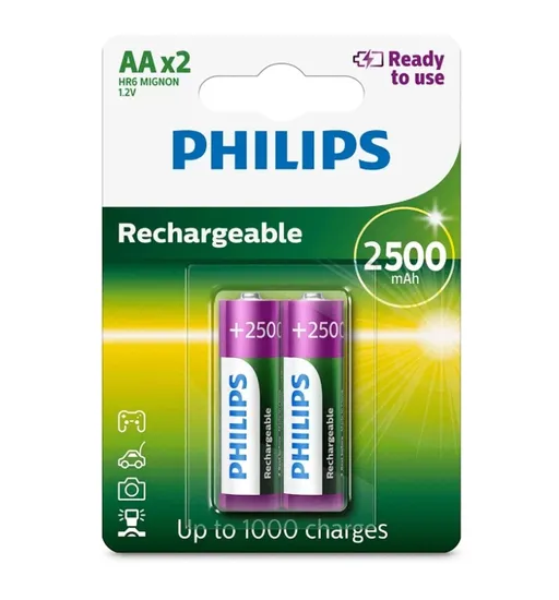 Especificações de Pilha Philips Recarregável AA 2500-Mah - com 2 Unidades (R6B2RTU25/97)