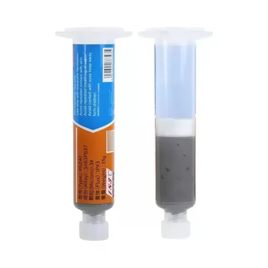 A Solda em Pasta (ou estanho em pasta) é utilizada para soldar componentes ou refazer soldas, trilhas, entre outros procedimentos. Sua utilização é mais prática e rápida que as esferas de solda, já que por ser em forma de pasta se funde com bastante precisão e rapidez quando aquecida com soprador de ar quente.