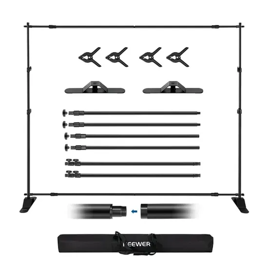 Altura y ancho personalizables: con cuatro barras transversales desmontables (dos superiores, dos inferiores) y dos postes de extensión telescópicos, este soporte de fondo ajustable ajusta fácilmente el ancho de 5.9ft/180cm a 9.8ft/300cm agregando o quitando barras transversales, y se ajusta a su altura preferida de 3.2ft/98cm a 8ft/245cm con un simple giro