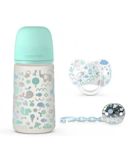 Suavinex Nuery Set Biberon 270 + Broche + Chupete Fisiologico 0/6 Memo Polipropileno/Silicona 270ML Azul