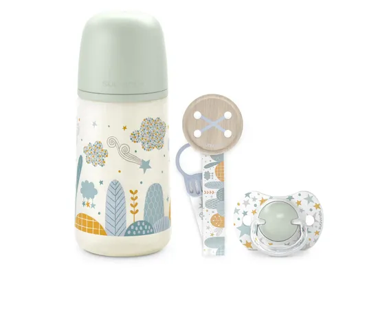 Suavinex Nursery Set Biberon 270 + Brocha + Chupete Fis 0/6 Dreams i3 Sil 0-6M+ Azul